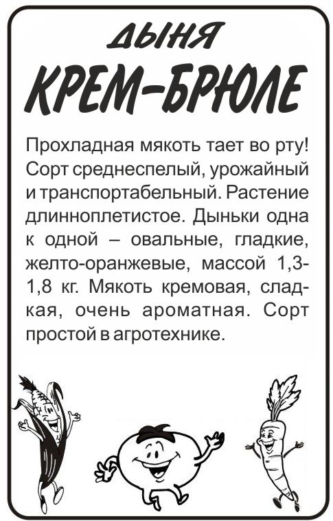 Сорт среднеспелый, урожайный и транспортабельный. Растение длинноплетистое. Дыньки одна к одной - овальное, гладкие, желто-оранжевые. Масса 1.3-1.8 кг. Мякоть кремовая, сладкая, очень ароматная. Сорт простой в агротехнике.