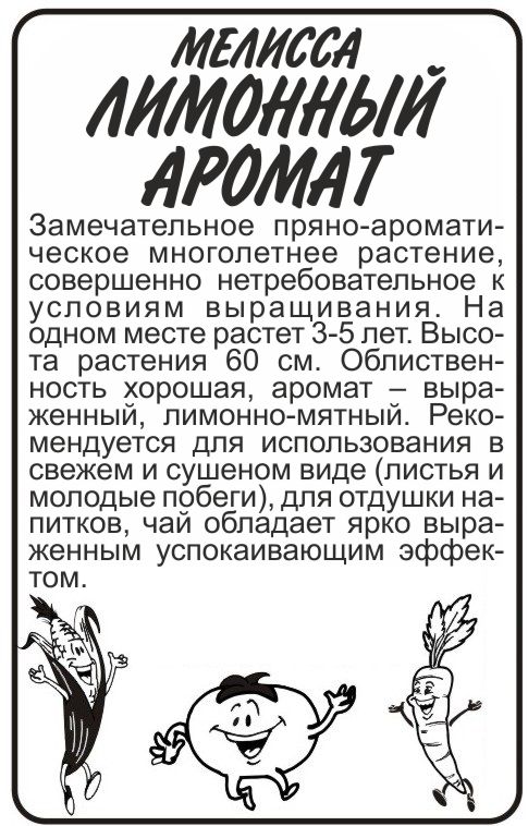 Замечательное пряно-ароматическое многолетнее растение, совер-шенно нетребовательное к условиям выращивания. На одном месте растет 3-5 лет. Высота растения 60 см. Облиственность хорошая, аромат – выраженный, лимонно-мятный. Рекомендуется для использования в свежем и сушеном виде (листья и молодые побеги), для отдушки напитков, чай обладает ярко выраженным успокаивающим эффектом. Растение холодостойкое, выращивается посевом семян в открытый грунт ранней весной (в мае) или рассадным способом (в конце марта — начале апреля).