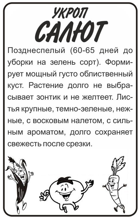 Позднеспелый (60 – 65 дней до уборки на зелень сорт). Формирует мощный густооблиственный куст. Растение долго не выбрасывает зонтики и не желтеет. Листья крупные, темно – зеленые, нежные, с восковым налетом, с сильным ароматом, долго сохраняет свежесть после срезки.